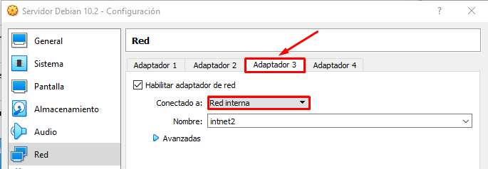 Como ya explique antes tendremos que configurar 3 tarjetas de red. Para esto nos situaremos en nuestra maquina virtual y configuraremos los parámetros de red. Tendremos que habilitar las tarjetas de red de forma que el servidor las reconozca al encenderse.