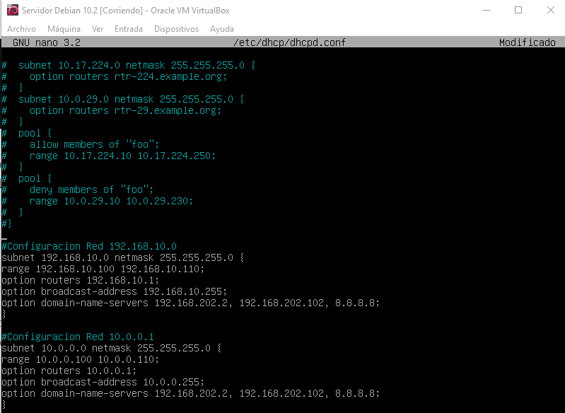 Añadiremos las dos interfaces de redes internas para que el DHCP las reconozca, guardamos y salimos. Ahora entraremos en el fichero de configuración del ámbito DHCP donde configuraremos los parámetros en los que trabajaran nuestras dos redes:
