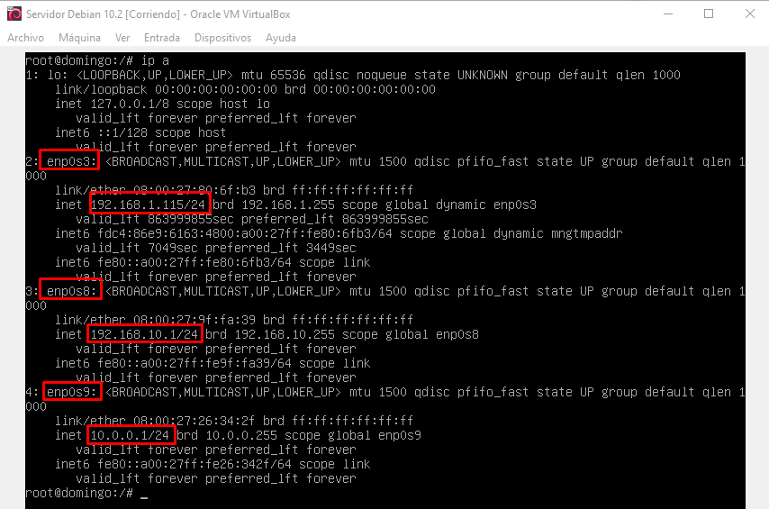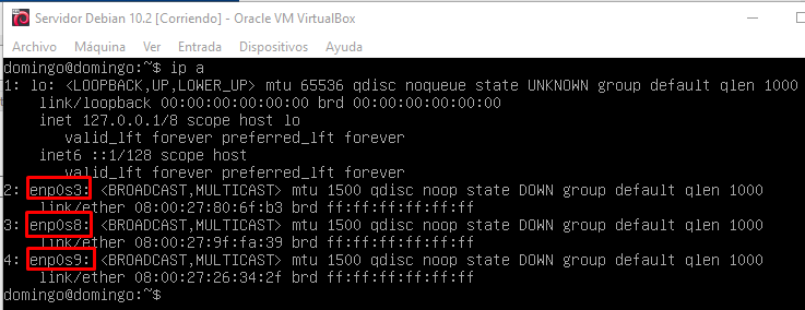 Al ejecutar el comando nos aparecerán todas las tarjetas de red añadidas anteriormente, lo importante es identificarlas y saber a que interfaz corresponde cada una. Por deducción la «enp0s3» sera la primera configurada como «puerta de enlace». La «enp0s8 y enp0s9» se configuraran como las redes internas para los clientes.