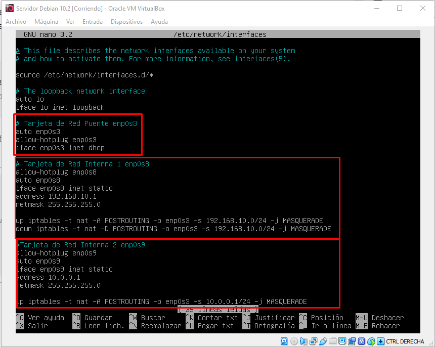#Tarjeta de Red Interna enp0s8 allow-hotplug enp0s8 auto enps0s8 iface enp0s8 inet static address 192.168.10.1 netmask 255.255.255.0