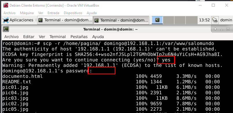 Para ello utilizaremos el comando «scp» que es para copiar archivos de una máquina a otra, utilizando el protocolo ssh que tendrá que estar instalado en las máquinas que se quieran pasar información. Esto lo utilizamos ahora porque no disponemos de entorno gráfico para arrastrar los archivos como anteriormente lo hacíamos.