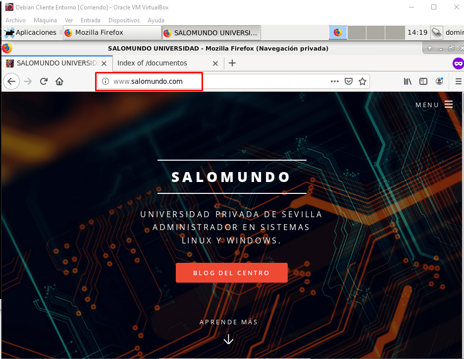 Reiniciamos el cliente para efectuar los cambios. Abrimos el navegador en entorno privado por problemas con las cookies y ponemos el nombre «http://www.salomundo.com«.