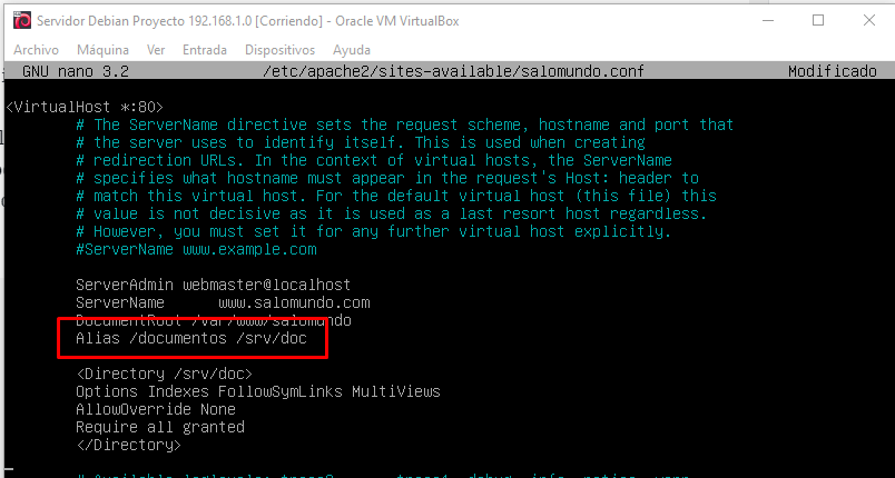 Lo que conseguiremos es que cada vez que entremos salomundo.com/documentos/, no entraremos en la carpeta «documentos» si no, en la carpeta «/srv/doc» con distintos archivos. Anterior a esto deberíamos haber creado una carpeta llamada «documentos» en la ubicación de nuestra página web.