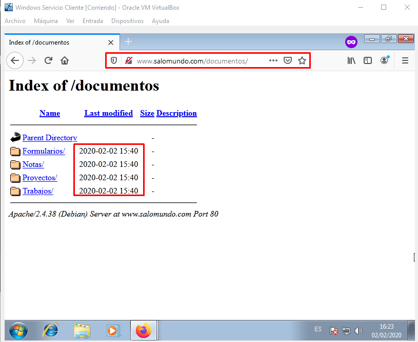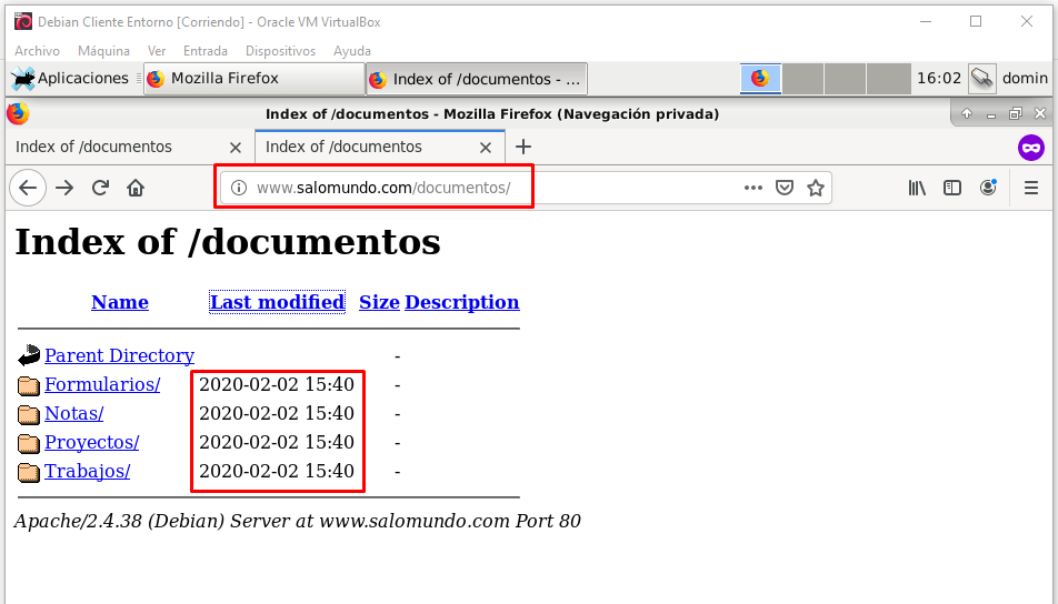 Si recordamos dentro del directorio /documentos dentro de la página web no hay ningún archivo. ¿Que está ocurriendo?. Muy simple el Alias nos está redireccionando a la carpeta «/srv/doc«. Ademas las fechas de los archivos coinciden con las creadas anteriormente.