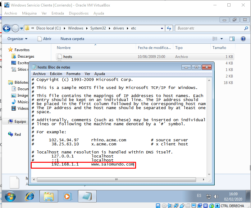 Entramos ahora en el windows 7 cliente para verificar que las páginas son accesibles desde los dos clientes. Modificamos el archivos hosts: