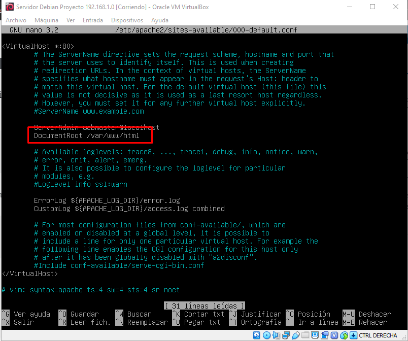 Si abrimos este fichero, encontraremos la ruta donde esta la página creada por defecto en la instalación. Nosotros crearemos un directorio diferente para almacenar la nuestra, es muy importante dejar este fichero por defecto para en el futuro tenerlo como copia de seguridad, si tocamos o borramos algo sin querer.