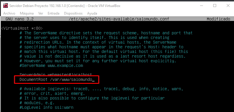 Editaremos el archivo «salomundo.conf» y especificamos en que ruta estará nuestra página web. En mi caso «/var/www/salomundo», creada anteriormente.