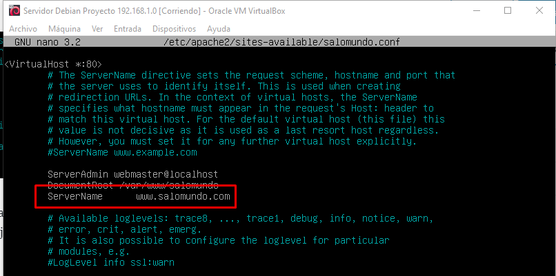 Ademas especificaremos el nombre que tendrá nuestra página web para no tener conflicto si queremos tener mas de un sitio web. Agregamos las siguientes líneas justo debajo de «DocumentRoot«.