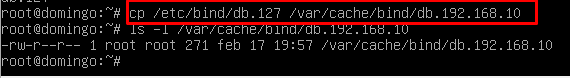 Ahora utilizaremos la plantilla para crear la zona de resolución inversa y lo copiaremos con el nombre de nuestra zona en «/var/cache/bind/db.192.168.10«.