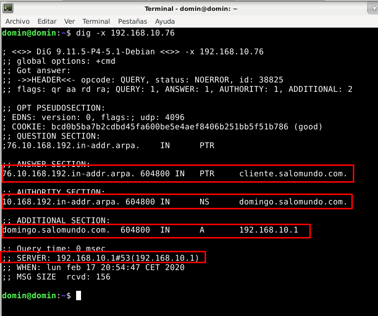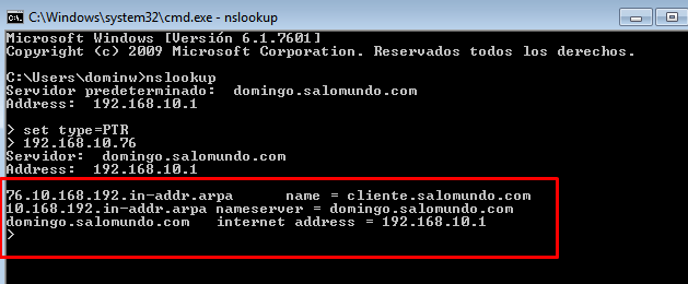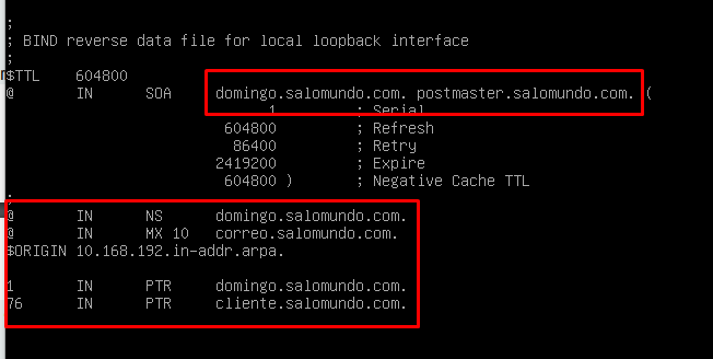Añadiremos el registro PTR: 192.168.10.76 que hace referencia inversamente a cliente.salomundo.com.