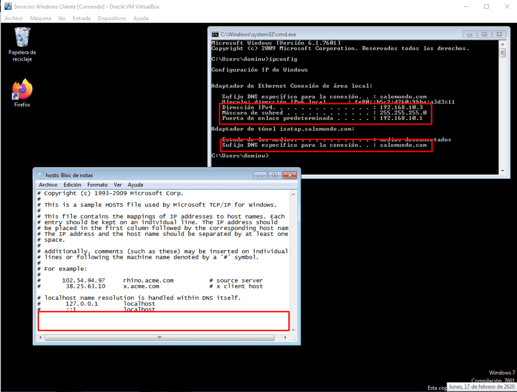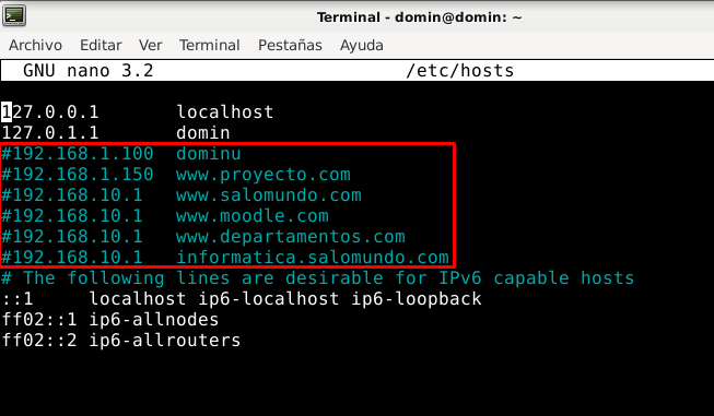Además las resoluciones en el fichero hosts están comentadas es decir no están funcionando.