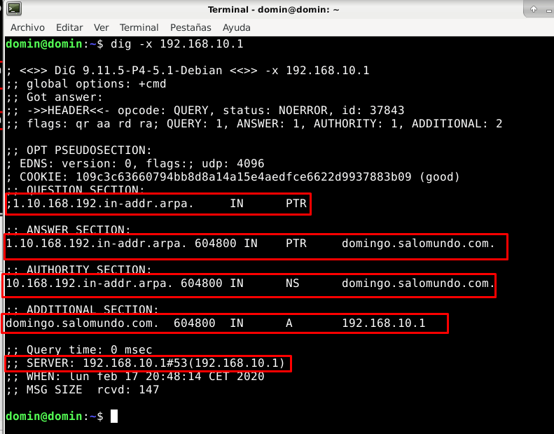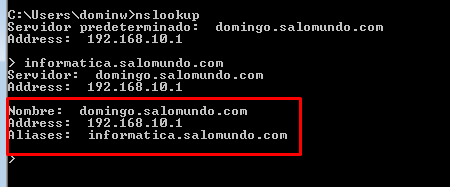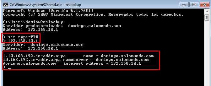Añadiremos el registro PTR: 192.168.10.1 que hace referencia inversamente a domingo.salomundo.com.