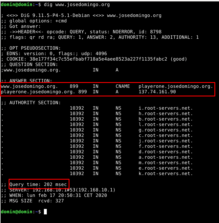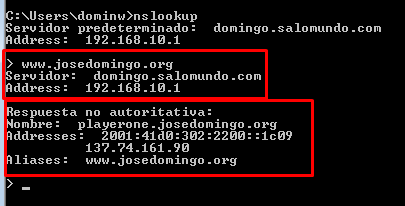 Aquí vamos a ver lo que estuvimos hablando antes de la caché del servidor DNS, cuando busquemos por primera vez la url de «josedomingo» tardará más tiempo de la cuenta ya que es la primera vez que la buscamos y además tiene que salir a fuera (internet) para encontrar la resolución del nombre.