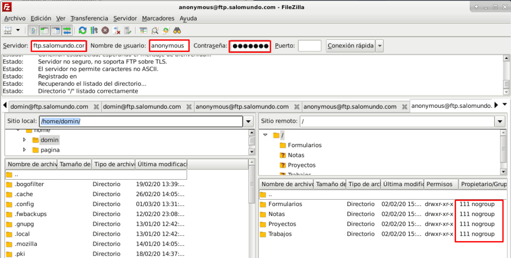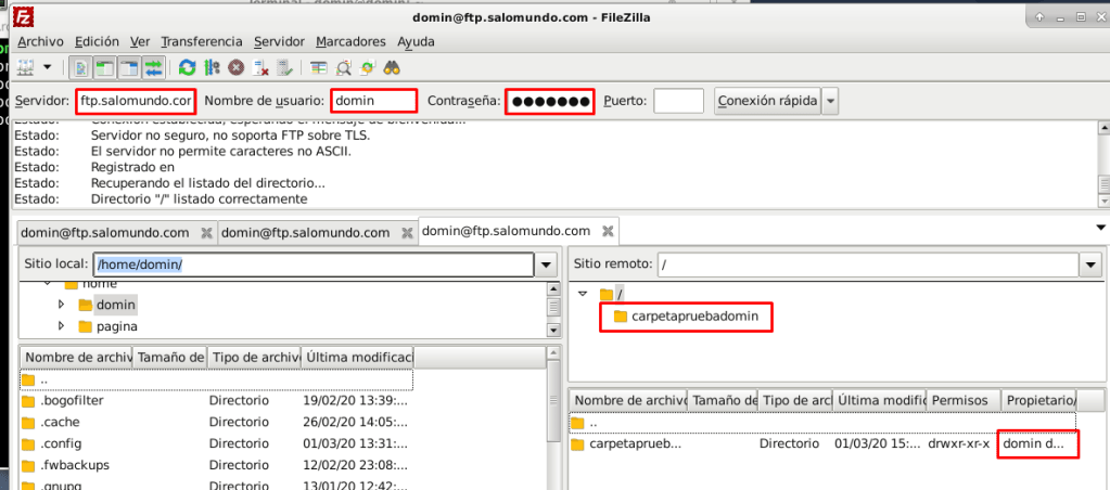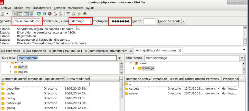 Ahora para acceder los archivos de la carpeta «domin» deberemos iniciar sesión desde Filezilla en el servidor: