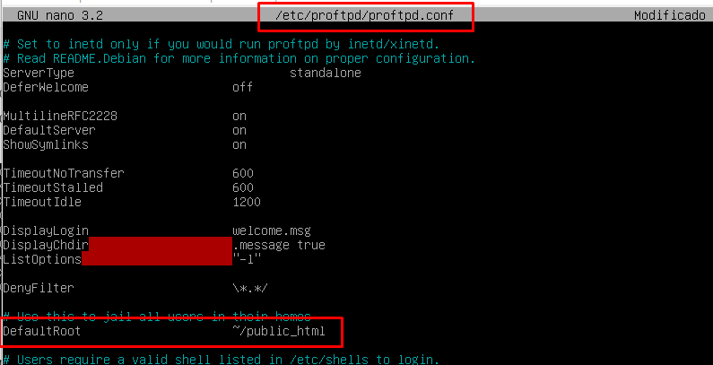 Ahora imaginemos que dentro del usuario domin hay muchas carpetas, pero nosotros queremos que los usuarios entren solo y exclusivamente a la carpeta «public_html» para que esto suceda tendremos que entrar a la configuración del archivo:
