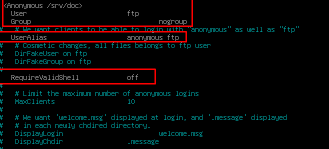 La otra manera de entrar a un servidor FTP sin usuario ni contraseña es la forma anónima, esta la configuraremos desde el siguiente fichero, en la configuración anónima especificaremos que el directorio por defecto de los usuarios anónimos sea /srv/doc.