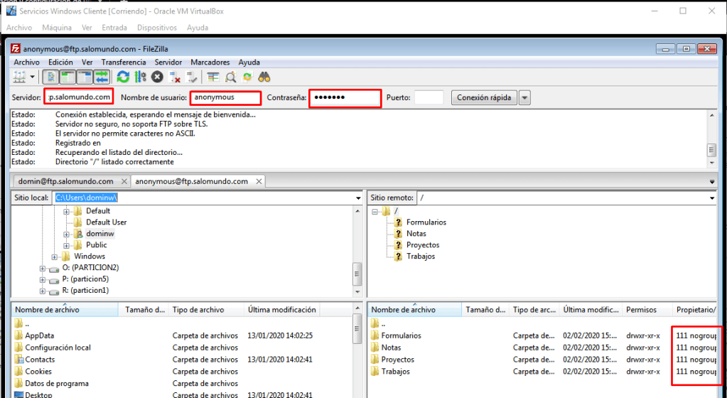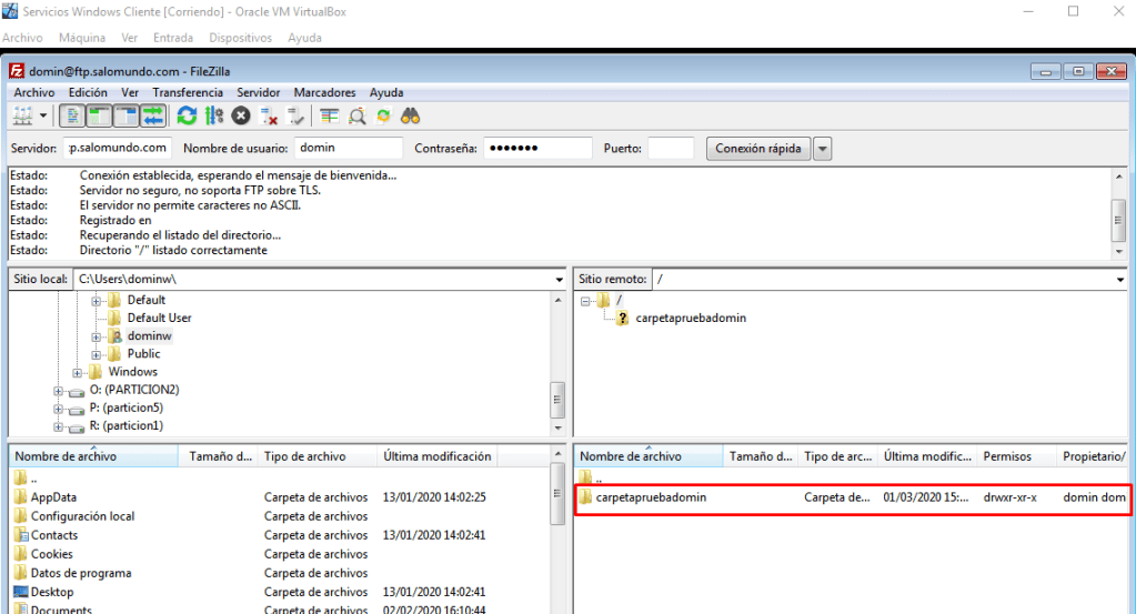 Para comprobar esto deberemos crear un usuario completamente nuevo y probar a entrar al servidor ftp.salomundo.com desde un cliente utilizando filezilla. Voy a entrar con el usuario «domingo» que esta creado automáticamente por el sistema.
