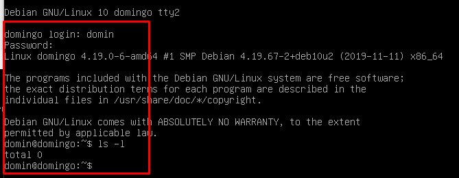 Después iniciamos sesión desde su cuenta para crear la carpeta /home/domin en mi caso.