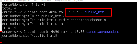 Volvemos al usuario domin y verificamos que la carpeta se creó correctamente y podemos crear contenido dentro.