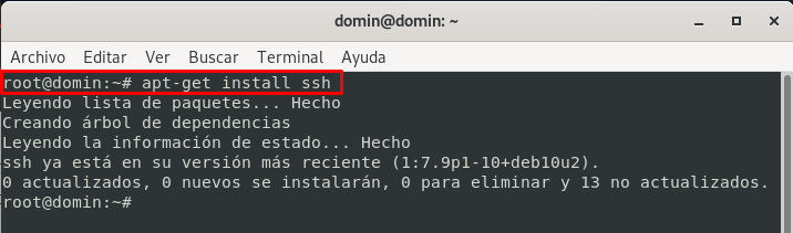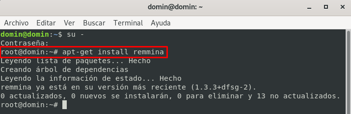 Vamos al cliente Debian para entrar como cliente remoto en el Ubuntu. Utilizaremos Remmina para acceder remotamente para ello lo instalaremos con un simple comando.
