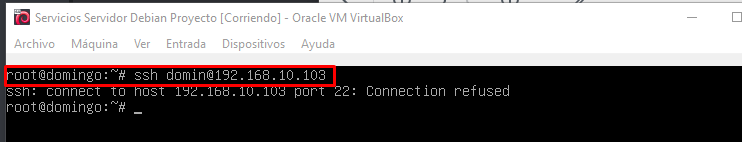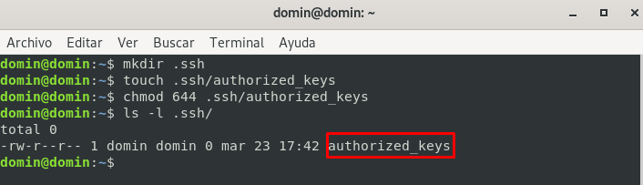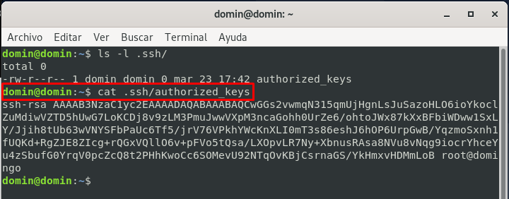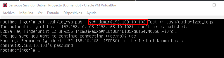 Ahora volveremos al servidor para inyectar la clave publica en el archivo de «authorized_keys«. El siguiente comando lo que haces es coger el fichero con la clave publica, conectarse por SSH al cliente con el usuario «domin» y la dirección 192.168.10.103 e inyectar en el fichero authorized_keys la contraseña publica del servidor.