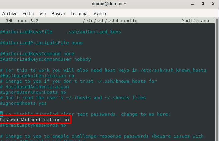 Cambiando la opción a «No» cada vez que iniciemos sesión por ssh no necesitamos poner la contraseña del usuario automáticamente se identifica con la clave publica.