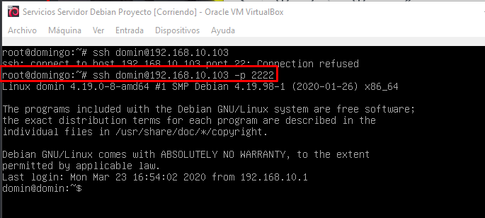 Como podemos ver nos aparece un error eso significa que tenemos que seleccionar el puerto por el que queremos entrar para ello utilizaremos la opción -p después del comando y el puerto por el que queremos entrar en este caso el 2222 establecido antes.