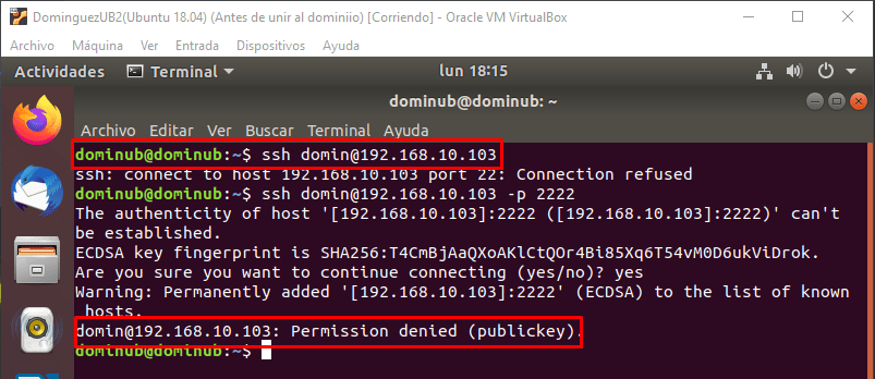Ahora mismo los únicos que nos podemos conectar con la maquina cliente somos el servidor, porque tenemos nuestra clave publica instalada en la maquina Debian. Ahora vamos a intentar establecer una conexión desde una maquina que no tiene la clave publica instalada como por ejemplo un cliente Ubuntu.