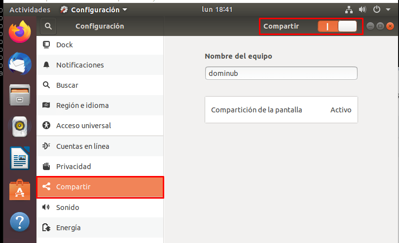 Configuración, Compartir. Activamos la opción (Compartir Escritorio)