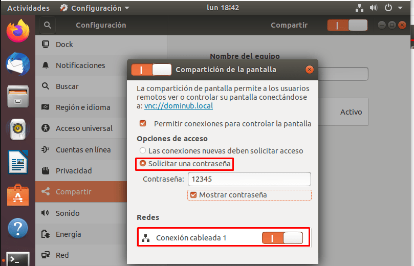 Activamos la opción de solicitar una contraseña y establecemos la contraseña 12345, para que cada vez que se quieran conectar tengan que poner esa contraseña por seguridad. Ahora estaría activado para poder entrar desde los otros cliente.