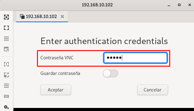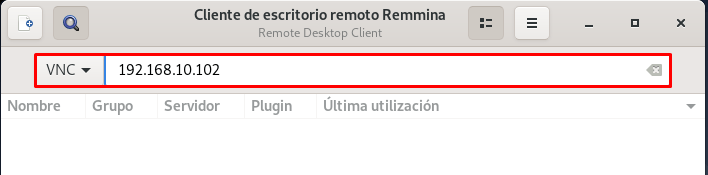 Iniciamos Remmina y escribimos la dirección IP de la maquina ubuntu. También tendremos que poner el protocolo «VNC» ya que se especifica en la practica y le damos a enter.