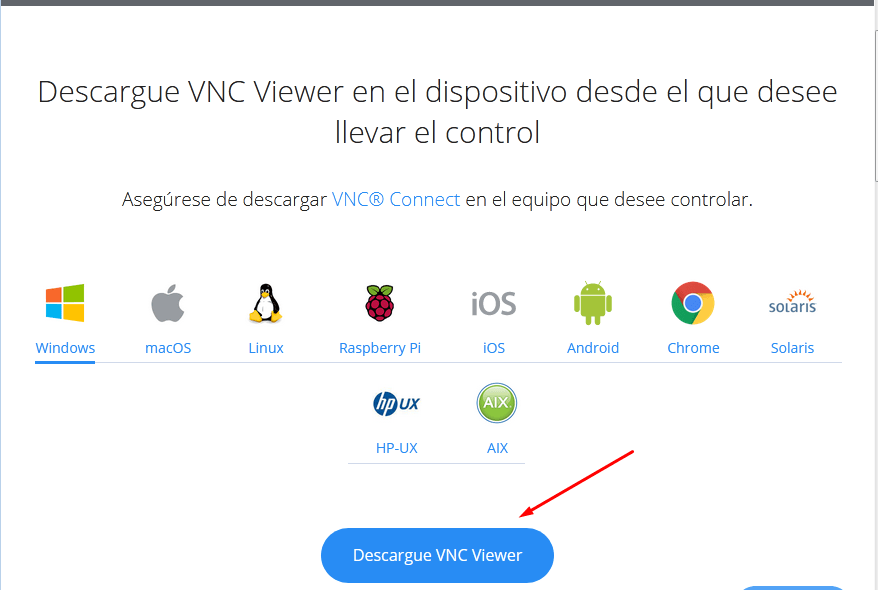 Entraremos en la pagina de VNC Viewer https://www.realvnc.com/es/connect/download/viewer/ ya que nos queremos conectar como cliente, decagramos e instalamos el programa.