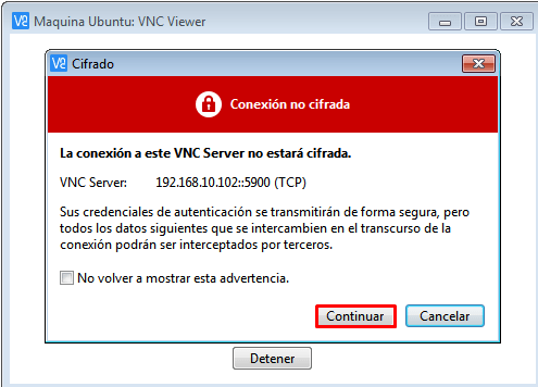 Como podemos ver nos avisa de que la comunicación no esta cifrada. Le damos a continuar.